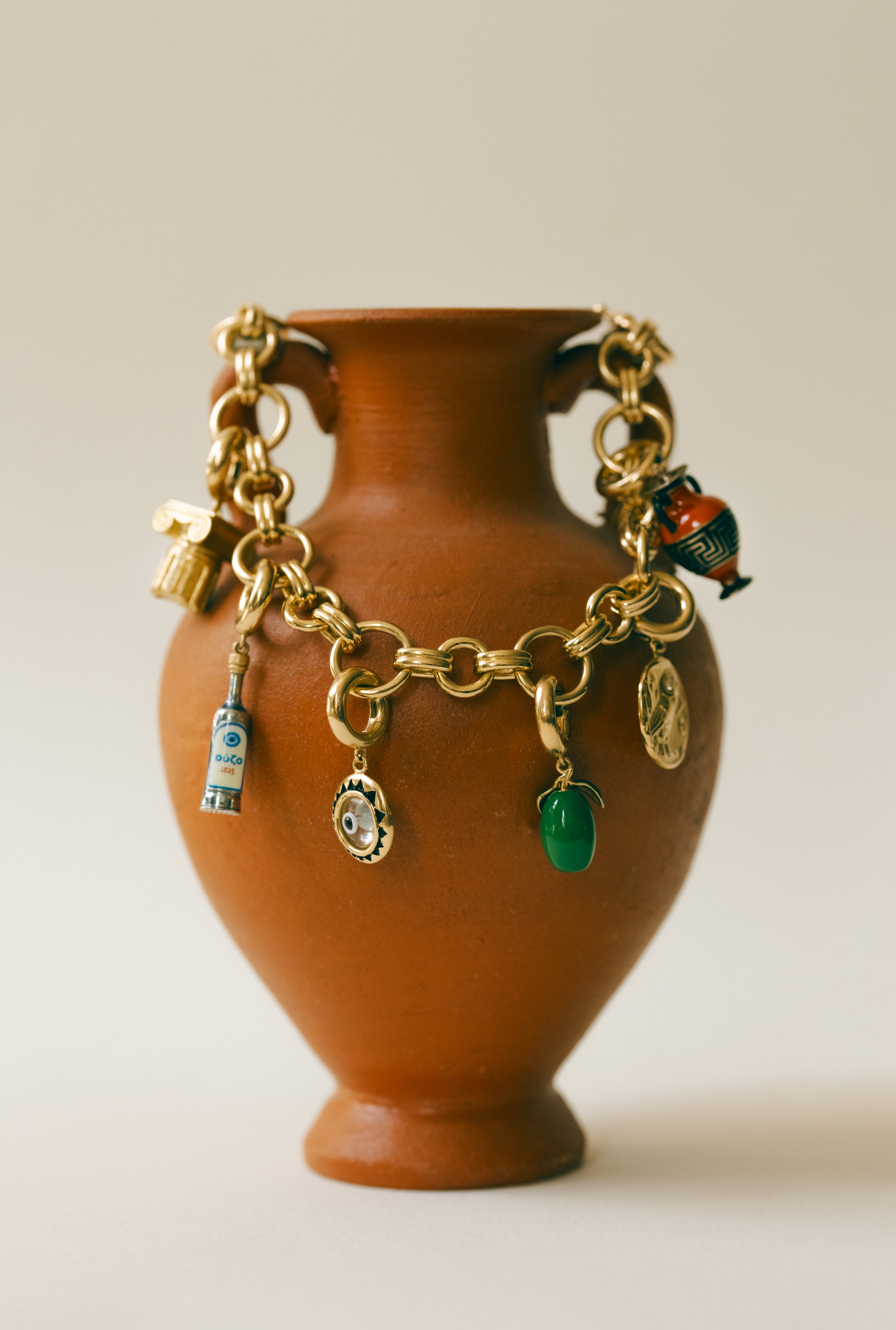 Crafted in 18k white or yellow gold and illustrated with intricate enamelling are an ionic column, an amphora, an ouzo bottle, an olive, an Athena coin, a cycladic figure, an anchor, and a mati eye. Each emblem symbolises an element of Greek life from the protective to the playful.